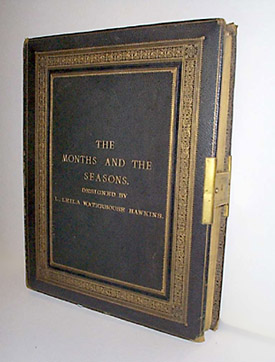 Series of 21 pen and ink drawings, including 12 allegorical images of the months of the year shown by zodiac constellations as interpreted in classical mythology, as well as seasons of the year and aspects of the creation of the earth, also as represented in classical mythological stories and figures. The drawings are mostly round, some shaped, and are mounted, as issued, in a rectangular cardboard mat with letterpress title/description. Bound as issued in a handsome green morocco leather binding, with stamped gilt decoration, and having brass lock clasp. Probably a manuscript for a proposed book.