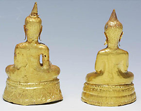 Small statues of the Buddha, seated in typical dhyanasana with hands in bhumisparsa mudra, one on double lotus base, the other on a tooled base.