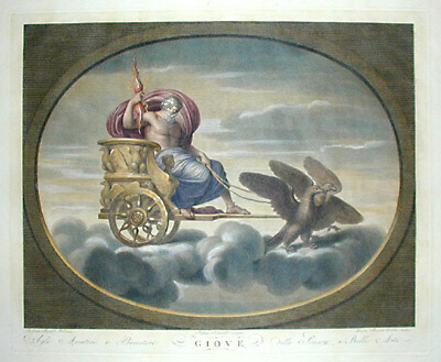 A pair of classical Roman gods in chariots in the clouds in the sky, each set in oval lozenge. Jupiter's chariot is drawn by a pair of eagles and decorated with gilt carved eagles and a pair of winged monopodia. He holds lightning bolts, his emblem (Jupiter was the Roman version of the Greek god Zeus). Mars, the god of war based on the Greek god Ares, is depicted as a nude male gladiator with a helmet and spear, on a horse-drawn chariot decorated with carved battle scenes. The print of Jupiter is dedicated, "Agli Amator e Promotori delle Scienze Belle Arti," i.e. to amateurs and professionals of the discipline of the fine arts. Mars is dedicated to various dignitaries and patrons.