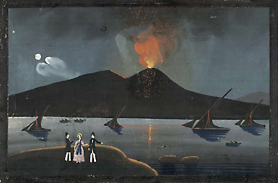 Pictures of Mt. Vesuvius in a folk art style. Paintings of the volcano were popular among tourists, produced by local Bay of Naples artists from the 18th century to the present. There were periods of volcanic activity, including eruptions, throughout the 19th century and into the 20th century, culminating in the major eruption of 1944.