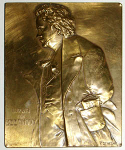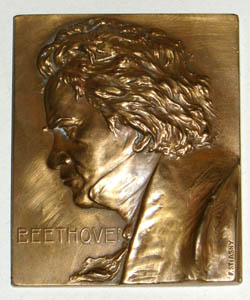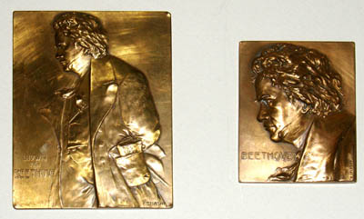 Two sensitively modeled bronze portrait medals of the famous composer Ludwig von Beethoven (1770-1827). Both depict him in profile, gazing downward as if deep in thought. The smaller one focuses on the head, the larger one shows a three-quarter-length view, with Beethoven dressed in a frock coat. The Art Nouveau style of the raised lettering suggests they date to the first quarter of the 20th century.