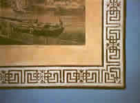 Pictured at left and right: A "print room" in a Swedish historic house displays views of European sites, surrounded by hand-painted borders painted directly on the wall -- and even the door (lower left).
