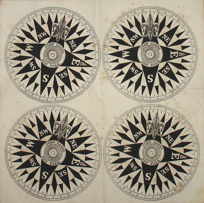 John Oakes (1818-1910) was a 19th century New York manufacturer and dealer of navigational equipment, such as compasses and charts. He was born at Bloomfield, New Jersey on November 22, 1818 and died at Glen Ridge, New Jersey on March 5, 1910. Active for over forty years in the mid-to-late-1800s, Oakes’ profession is listed in New York City directories from 1848 to 1896 as “a dealer in charts and a manufacturer of nautical instruments.” One surviving example of a brass Oakes compass is documented by the Virtual Musuem of Surveying alongside an entry for John Oakes in the Compass Maker Directory. It is a compass of polished brass with a magnetized needle and glass bevel, within an overall brass structure with two vertical sighting vanes, indicating its use in land-based surveying rather than maritime navigation. The compass face is engraved directly onto the brass dial, rather than employing a lithographed insert, evidencing to Oakes’ versatile designs and diverse manufacturing methods.