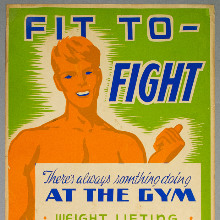 An original illustration art painting, likely a poster design, promoting physical fitness through sports for young men. The title “Fit-to-Fight” strongly suggests that it was a design developed in connection with a U.S. or local government program anticipating the need for men to be fit for military service. Thus it encouraged physical training as a patriotic duty. The main subject of the work is a handsome shirtless young man holding a placard with the heading “There’s always something doing at the gym.” This is followed by a list of athletic activities available there: “weight lifting, basketball, volleyball, badminton, wrestling, hand ball, boxing, squash.” The design is rendered in flat contrasting colors: bright orange and tan for the young man, lime green for the background, and bright blue for lettering, as well as the man’s eyes and mouth. At the bottom, the words “Winter Program” appear in slender blue letters. Related governmental fitness posters are extant. For example The United States Public Health Service, Washington, D.C. published a mid-century poster titled “Keeping Fit” featuring a black and white illustration of a young man athlete running as if in a track and field event. That poster included the credit that it was “in co-operation with the American Social Hygiene Association” located in New York City.