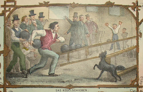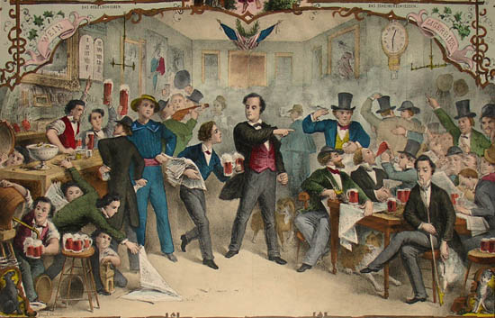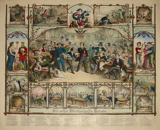 The publisher, Henry Schile, produced many prints aimed at an audience of fellow German immigrants. Inasmuch as Schile was a New York City publisher that frequently published New York City scenes, it is quite possible that the tavern depicted was based on one or more such establishments located there. During the first half of the 19th century there a steady flow of German immigrants into Manhattan, so by 1855, it had the third largest concentration of Germans after Berlin and Vienna. By the 1870s, when this print was published, it has been estimated that German immigrants and their American offspring made up roughly 30% of the population of New York City. Most were concentrated in the Lower East Side’s “Little Germany,” which was also the German cultural capitol of the U.S. (Haberstroh).