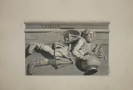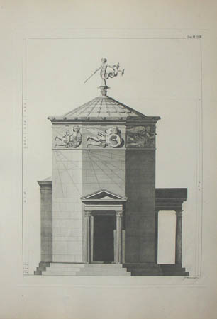Chapter 3: Octagon Tower of Andronicus Cyrrhestes. The plates depict the structure variously known as the Tower of the Winds or the Horological Monument of Andronicus Cyrrhestes. Still standing in the Roman agora today, this 40-foot-high octagonal marble tower served as an enormous weathervane and timekeeper. Each of the eight sides bears a figure in relief representing the direction of the wind that blows against that side. According to an early description by the ancient Roman architect, Vitruvius, on the conical top of the tower a bronze figure of the Greek sea deity Triton once turned in the wind, and where he stopped, the wand in his right hand pointed toward the sculpture representing the wind blowing at that time. Restoration of the Tower of the Winds was carried out in 1915-19 and 1975-76.