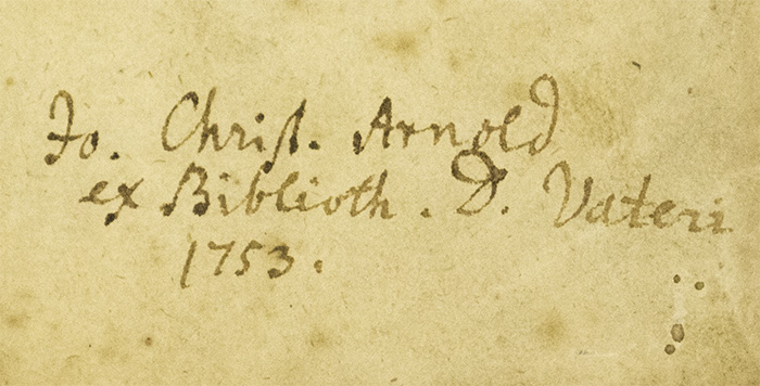 Inscription on front free endpaper in manuscript ink: “Fo. Christ. Arnold ex Biblioth. D. Vateri 1753.”