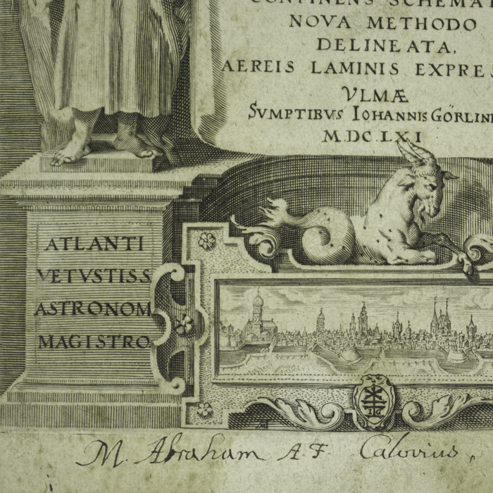 Remarkably, our particular atlas was originally owned by the famed theologian Abraham Calovius (1612–1686), an ardent defender of strict Lutheran orthodoxy. His name, likely in his own hand, is written in ink in the bottom margin of the title page as “M. Abraham AF Calovius.” “M.” likely stands for Magister, denoting a Master’s degree holder, common for academics/theologians. “A.F.” signifies Abrahami Filius, Latin for “Son of Abraham,” a common practice to distinguish lineages in historical records and signatures inasmuch as he was named after his father of the sme name. It is somewhat ironic that Calovius owned this Bayer atlas — a ground-breaking scientific work — in that he rejected the heliocentric model of the universe of Nicolaus Copernicus (1473 –1543) on religious grounds. Indeed, Colovius is famously known for saying “Who will venture to place the authority of Copernicus above that of the Holy Spirit?”
