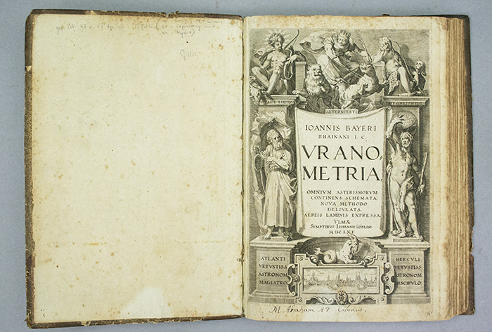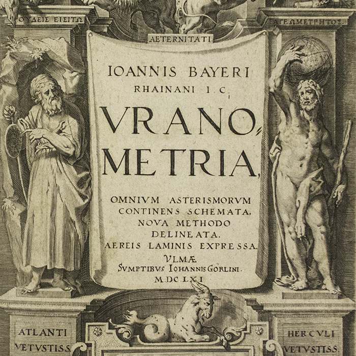 Full title: Uranometria: omnium asterismorum continens schemata, nova methodo delineata, aereis laminis expressa. [Uranometria, containing charts of all the constellations, drawn by a new method and engraved on copper plates].