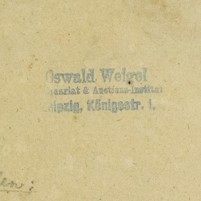 Blue ink ownership stamp, inside front cover: “Owald Weigel/ Antiquariat & Auktions-institut/ Leipzig, Kunigsstr. 1.”