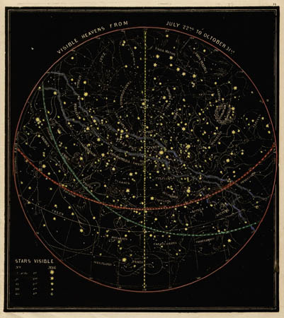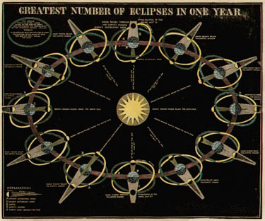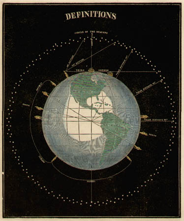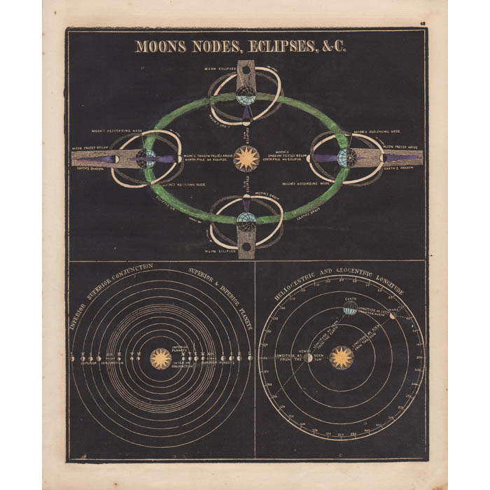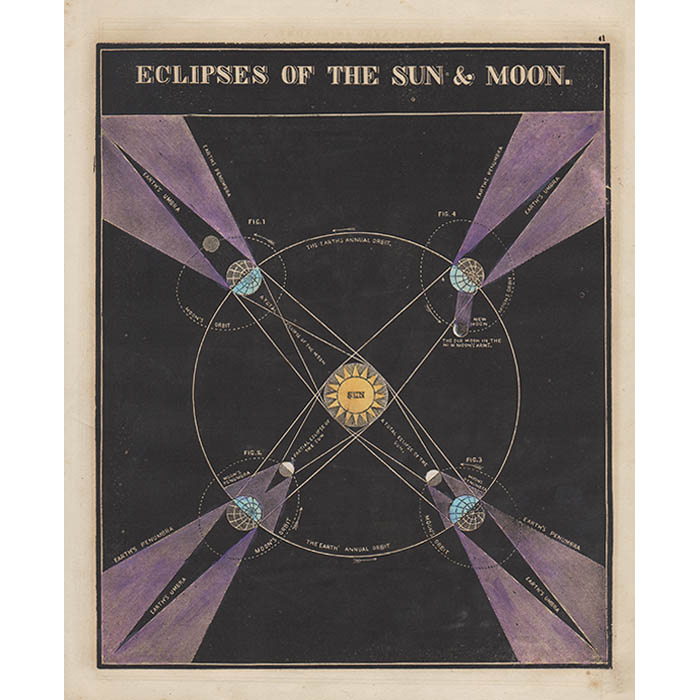 Smith’s Illustrated Astronomy was the most popular American pictorial astronomy guide of the 19th century. It contained numerous scientific diagrams demonstrating or showing principles of planetary motion and features, other astronomical phenomena, the moon, and the constellations. Also included is a picture of the use of an orrery in an elementary classroom. The visual elements in Smith’s astronomical prints are characterized by simple graphic images against a black background, as well as repeating geometric forms and linear elements, typically circles and ovals. Originally copyrighted in 1848, numerous editions followed up to 1866.