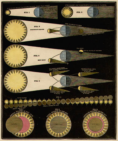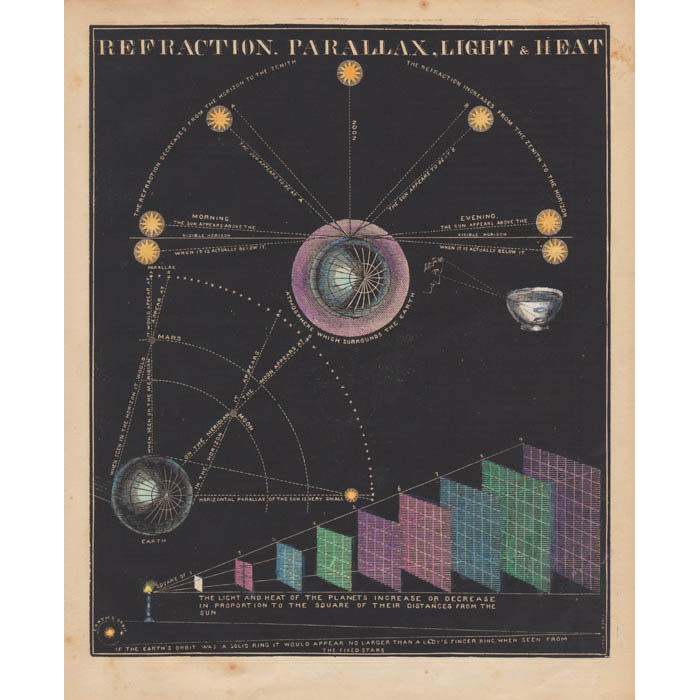 In his Preface, Smith, the Principal of Public School No. 12, located at 17th Street and Eighth Avenue in New York City, explained that the purpose of this series was “to present all distinguishing principles in physical Astronomy with as few words as possible; but with such ocular demonstrations, by way of diagrams and maps, as shall make the subject easily understood.”  He also noted that “[t]he Diagrams, which are larger and more full than those of any other work adapted to common schools, are many of them original in their design.”  Smith further stated that the creation of Smiths Astronomy “occupied the whole of his spare time for nearly three years; the most laborious part of it being the drawing of the diagrams, &c. on wood, ready for the tool of the engraver which was done by the Author himself.”  In other words, Smith created and drew each print on a woodblock, and then a specialist wood engraver engraved the images into the wood for printing.