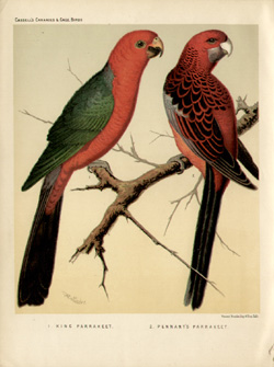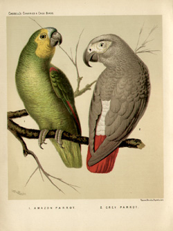 Series of colorful prints of varieties of parrots that could be kept in public or large private aviaries. Other birds in the set include canaries, woodpeckers, and cardinals. The parrots are shown perched in trees.