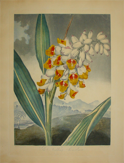 Robert John Thornton began his career as a doctor. In 1797, he opened a successful practice in London. Meanwhile, he had become deeply interested in botany under the influence of Thomas Martyn’s lectures and the writings of Linnaeus. In 1797, he also began advertising for subscribers to his planned natural history publishing venture, which eventually became known as The Temple of Flora, comprised of 30 folio botanical plates (generally issued with just 28), as well as two classical allegorical plates. It was originally published as the third section of an extensive and ambitious botanical publication titled New Illustration of the Sexual System of Linnaeus.