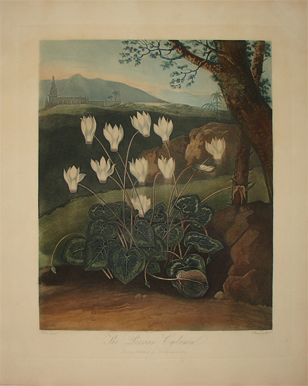 Scholar Rodney King described this print as follows: “The Persian Cyclamen [Cyclamen persicum Miller], parent of the florist’s cyclamen […] is a native of the countries and islands at the eastern end of the Mediterranean but not of Persia itself. It is the largest flowered of an attractive genus of small plants much grown in modern times by connoisseurs. The Persian Cyclamen was not the first of its kind to become known in western Europe. Cyclamen europeaum, the ‘Bleeding Nun’, as it was called, was thought to be dangerous to pregnant women: any unfortunate lady in this condition who stepped over it might immediately miscarry. John Gerrard, the Elizabethan herbalist, believed this implicitly and describes how he fenced his plants around with sticks with others laid across them ‘lest any woman should, by lamentable experiment, find my words to be true, by stepping over the same.’ When the baby was nearing full term, and delivery was to be encouraged, wearing of the disc-like tuber, ‘hanged about’ the expectant mothers, had a salutary effect, and Gerrard told his wife to use it when attending confinements. Its use by midwifes dates back to the days of the Greeks.” (Ronald King, The Temple of Flora by Robert Thornton. 1981, p.52).