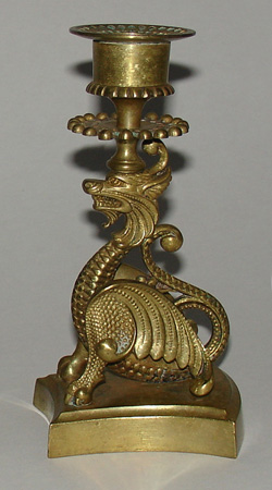 An unusual pair of diminutive candlesticks, each in the form of a winged dragon, in the Asian-influenced Art Nouveau taste. Each with decorated and beaded bobeche, and raised on an incurved plinth.