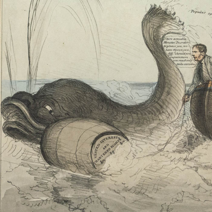 John Doyle (1797-1868) was an Irish political cartoonist, caricaturist, painter, and lithographer. Doyle is known by the pen name “H. B.,” constructed out of two Js and two Ds, his own initials, and is considered a founder of the British political cartoon tradition. Doyle trained first in landscape painting under the artist Gaspare Gabrielli and later in miniature portraiture under John Comerford as a student at the Royal Dublin Society’s drawing school. Doyle found relative success as a painter, receiving a commission to paint equestrian portraits of the Marquess of Sligo and Lord Talbot, the Irish viceroy, as well as equestrian prints entitled The Life of a Racehorse. Doyle received a gold medal in 1805 as a student at the Royal Dublin Society and again found institutional recognition in 1825 when his painting Turning out the Stag was exhibited at the Royal Academy in London. Doyle gradually pivoted to political cartoons, with his career taking off in 1830s as enabled by the new reproductive medium of lithography. His cartoons would be published semi-anonymously under the name “H.B.” once a month, in line with the parliamentary session schedule. At the height of his popularity in the 1840s, indices of his prints were published in Thomas McLean’s The Times.