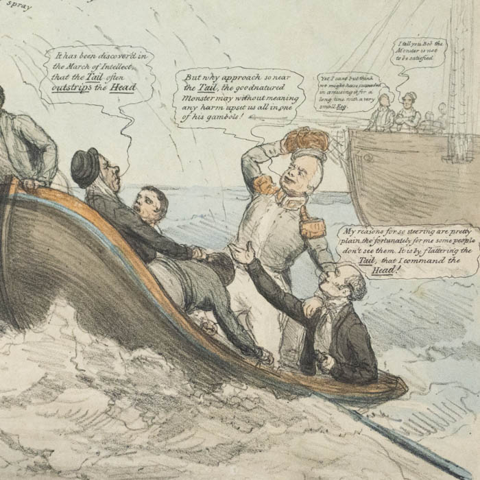 In the offered satirical print, reformist leaders such as Henry Brougham, 1st Baron Brougham and Vaux, and John George Lambton, 1st Earl of Durham, feature prominently; they are shown in the central image, grappling with the chaos of the churning sea and threatening monster, while Charles Grey, 2nd Earl Grey, steers the vessel as Prime Minister. Other reformers, including John Charles Spencer, 3rd Earl Spencer, are also present in the caricature, depicted as actively working to stabilize the boat. King William IV, who played a critical but cautious role in the crisis, stands within the rocking vessel and criticizes Prime Minister Grey, underscoring his reluctance to fully embrace the reformist cause: “But why approach so near the Tail, the good natured Monster may without meaning any harm upset us all in one of his gambols!” The reformers, led by Grey, charge forwards: “My reasons for so steering are pretty plain, though fortunately for me some people don’t see them. It is by flattering the Tail, that I command the Head!” Meanwhile, Conservative statesmen Sir Robert Peel, 2nd Baronet, and Arthur Wellesley, 1 Duke of Wellington, sail at a safe distance on a larger ship, declining to rescue their fellow politicians and trivializing the harrowing efforts of the reformers.