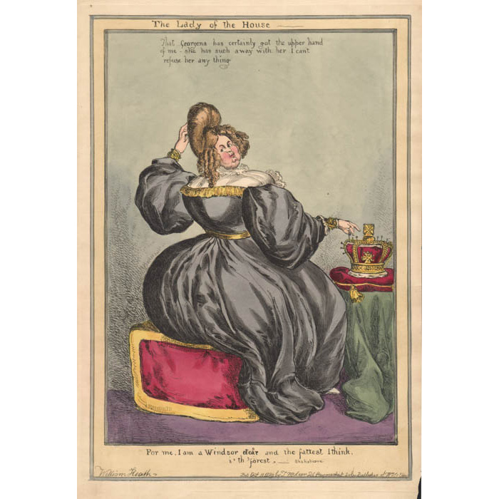 The Lady of the House, Plate No. 1: “That Georgena has certainly got the upper hand of me – she has such a way with her I can’t refuse her anything. The bottom caption reading – for me I am a Windsor dear, and certainly the fattest I think. I’th’forest, – Shakespeare”