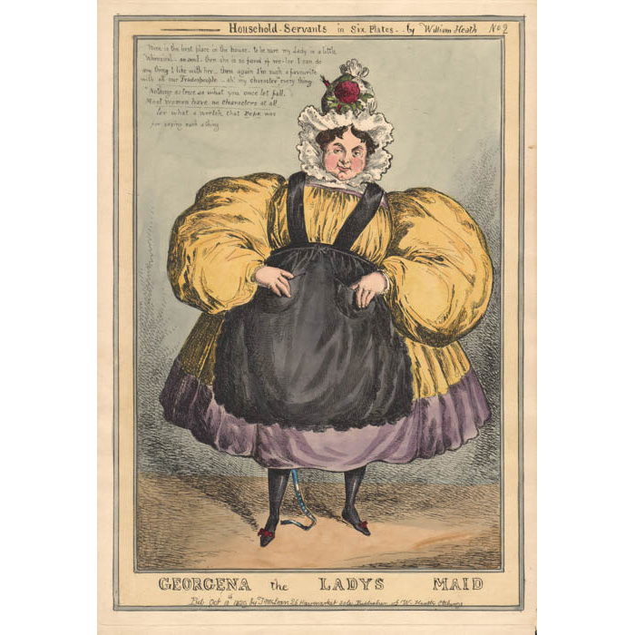 Georgena the Ladys Maid, Plate No. 2: “Mine is the best place in the house – to be sure my lady is a little whimsical – so am I. Then she is so fond of me – lor I can do anything I like with her – then again I’m such a favorite with all tradespeople – ah my character is everything- ‘Nothing so true as what you once let fall. Most women have no character at all.’ For what a wretch that Pope was for saying such a thing.”
