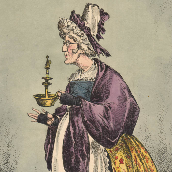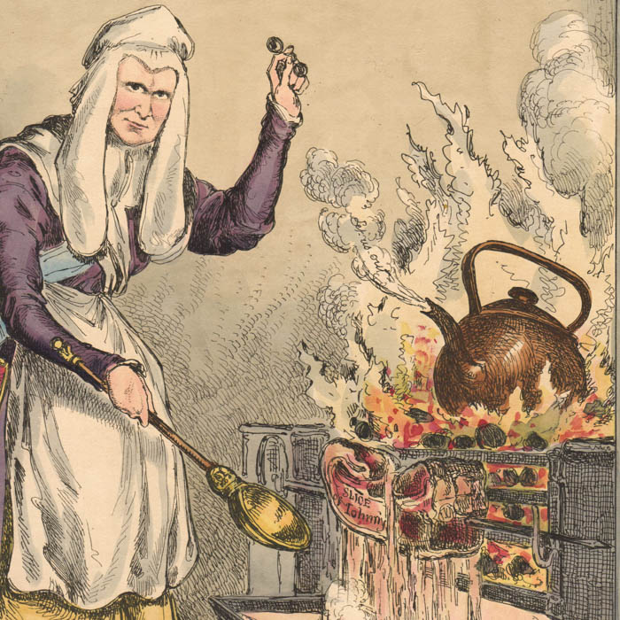 The people in the six prints, published in 1829, are recast as a dysfunctional aristocrat wife and her domestic staff, through thinly veiled alternate names and textual captions, as well as visual caricature. In Plate No. 1, Lady Conyngham, mistress to King George IV, appears as the “Lady of the House,” seated on a red throne and picking bobby pins from the King’s crown and placing them in her own hair. This is a direct reference to Elizabeth Conyngham (1770–1861), an English courtier and noblewoman. In Plate No. 2, the King is portrayed as “Georgena the Lady’s Maid,” simpering and subservient. Here, the feminization of George IV underscores his perceived moral corruption and subjugation to Lady Conyngham’s influence. In Plate No. 3, the Duke of Wellington, then Prime Minister, is shown as “Mrs. Double. U. the Housekeeper,” bemoaning the difficulty of managing unruly servants that she refers to in the caption as “sluts.” This is in reference to the Duke’s aristocratic and out-of-touch attitude and his struggles leading a fractious cabinet. Plate No. 4 shows Sir Robert Peel as “Robertena Peelena the Maid of All Work,” scrubbing the floor with a mop labeled “Free Trade.” Peelena defends an alliance with a “thief-taker,” referencing Peel’s role in founding the Metropolitan Police, who were widely assumed to spy on the public and be corrupt and violent. In Plate No. 5, “Old Mother Scarletta the Laundress” is seen boiling scandalous “criminal information” in a wash tub. The text indicates that she is cleaning the dirty laundry of the Duke of Wellington. In this context, “Scarletta” might be another reference to George IV, or the royals in general, inasmuch as the king was often depicted in portraits in a vibrant scarlet field marshal’s uniform. In Plate No. 6, Lord Lyndhurst, the Lord Chancellor, appears as “Coplinda Lindhursta the Cook.” Lyndhurst is shown aggressively tending to a roast labeled “Loe Johnny,” likely mocking the Whig politician Lord John Russell. Further elucidation of the meaning of each caricature can be discerned from the original text, shown in full below.