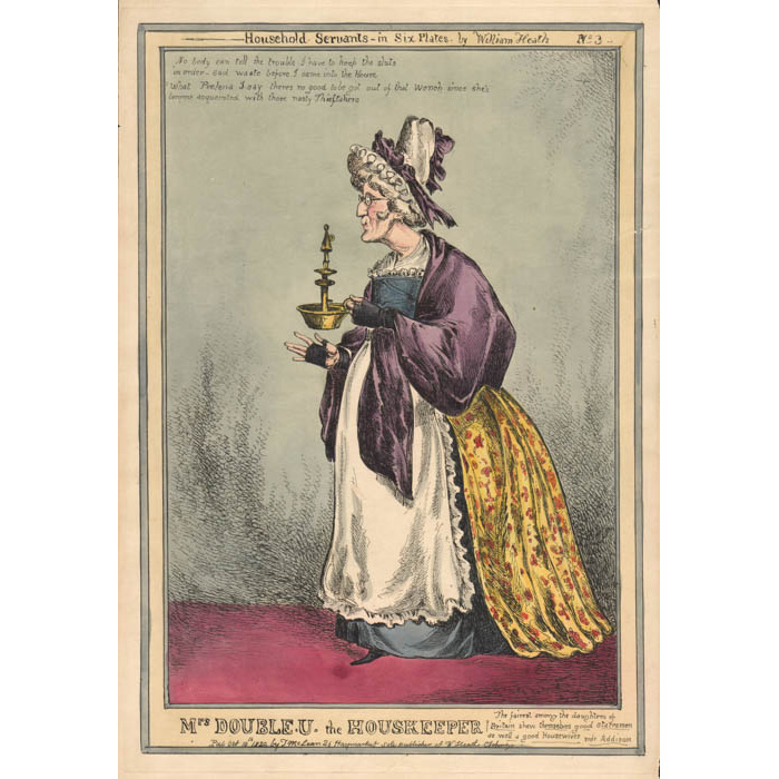 Mrs. Double. U. the Housekeeper, Plate No. 3: “Nobody can tell the trouble I have to keep the sluts in order – sad waste before I came into the House. What Peelena I say there’s no good to be got out of that wench since she’s acquainted with those nasty thief takers. – The fairest among the daughters of Britain show themselves good statesmom as well a good Housewives.”