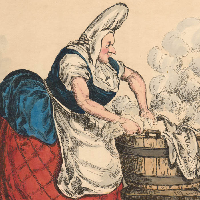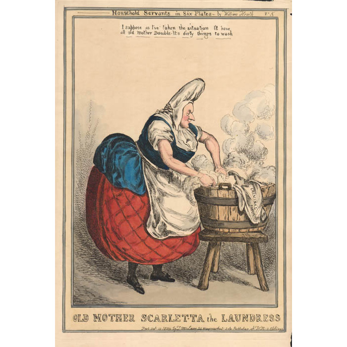 Old Mother Scarletta the Laundress, Plate No. 5: “I suppose I’ve taken the situation. I’ll have all old mother Double U’s dirty things to wash.”