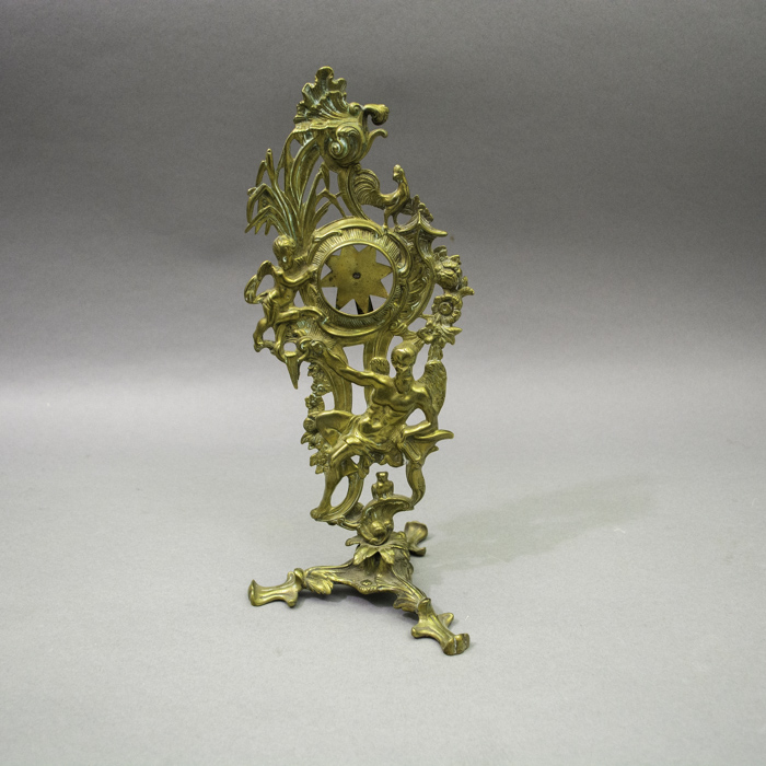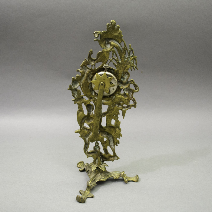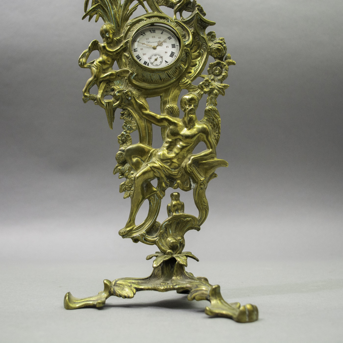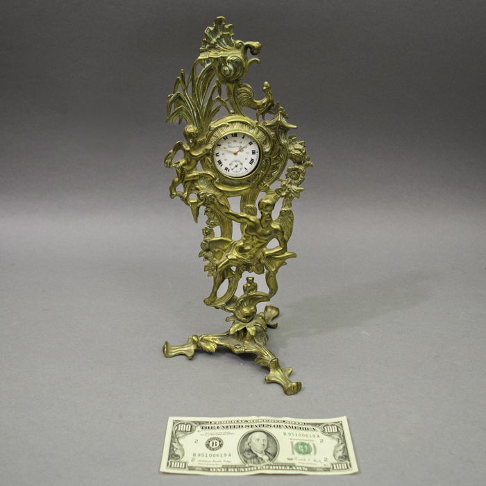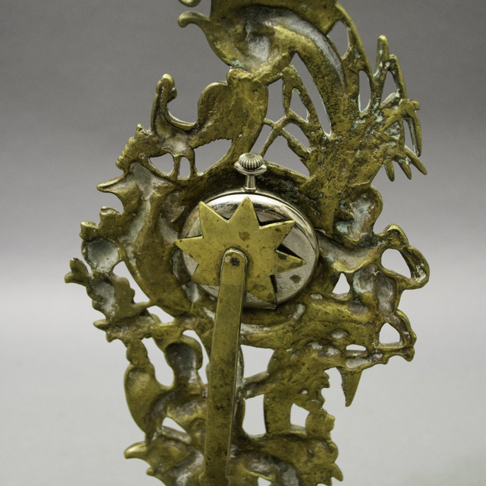 Condition: Very good antique condition. The cast brass exhibits a handsome, warm patina with minor surface wear and oxidation commensurate with age. The mechanical star-form holder functions properly. The pocket watch is in visually good condition with light wear to the case and dial; its working order has not been tested and it is sold separately as a decorative accessory.
