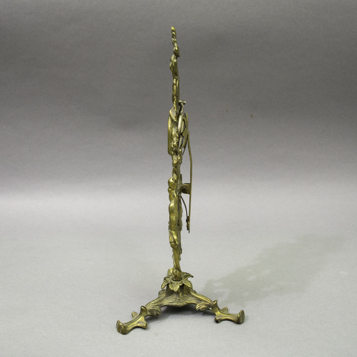 The hutch is a quintessential example of the Victorian Rococo Revival, a prominent design movement of the mid 19th century that romanticized the asymmetrical, curvilinear elegance of 18th century French rococo decorative arts. This style is characterized by the exuberant use of pierced C-scrolls, acanthus leaves, and dynamic naturalistic motifs. In this piece, the flowing, organic brass framework seamlessly integrates the figurative elements, creating a sense of restless movement and theatricality typical of the period’s finest domestic metalwork.