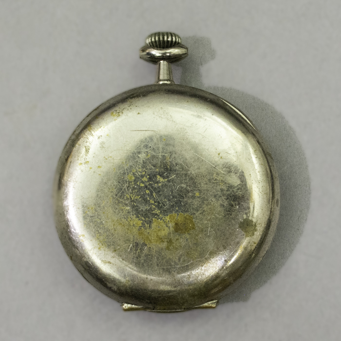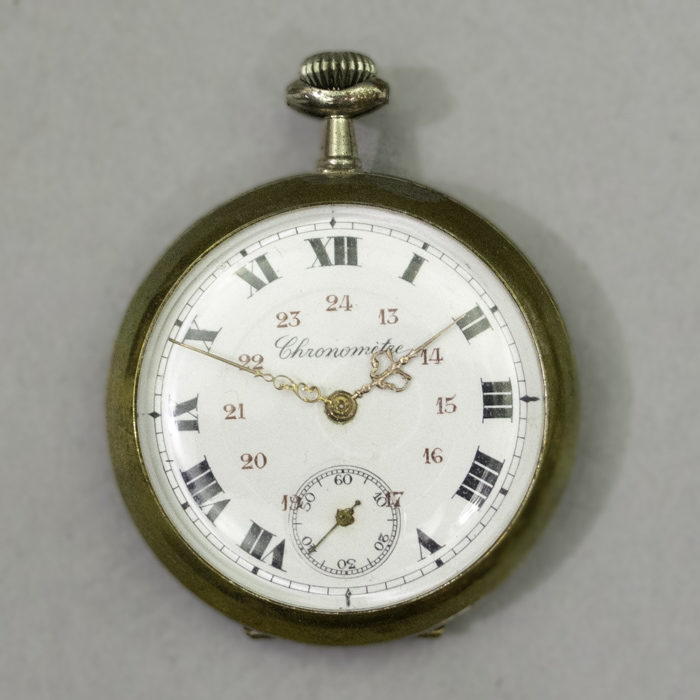 The accompanying pocket watch currently housed in the hutch features a white enamel dial marked “Chronometre,” indicating Swiss manufacture. It is designed with a hinged backpiece to protect the rear of the case. While the exterior of the case is unsigned, the internal works may bear a maker’s mark, though the watch has not been opened to determine this.