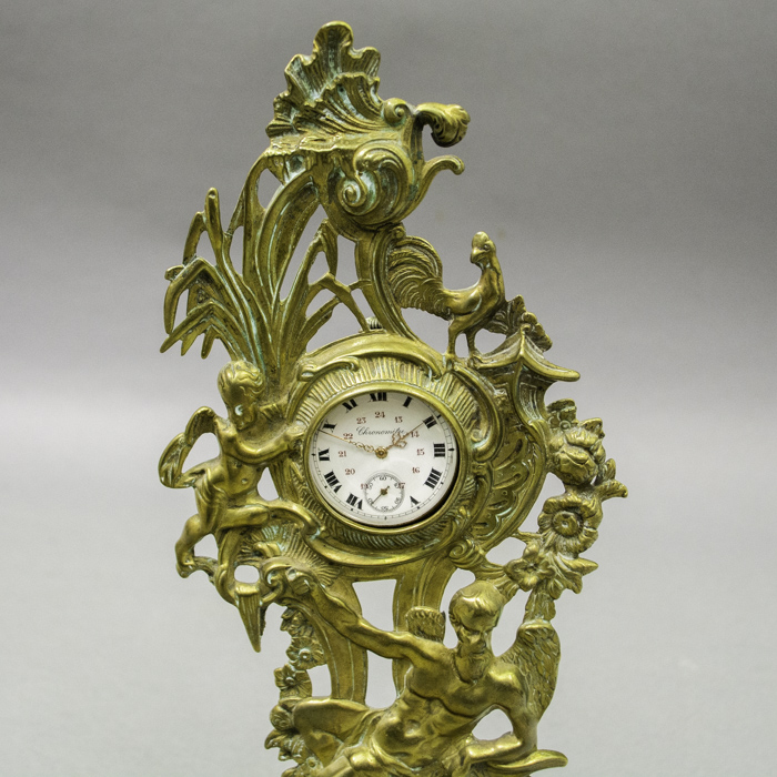 The incorporated figures are traditional allegorical symbols representing the various cycles of the universe and the inevitable nature of the passage of time. The rooster at the crest symbolizes the morning, heralding the dawn and the awakening of a new day. Conversely, the owl at the base represents night, darkness, and wisdom, acting as the nocturnal counterpart to the rooster and completing the 24-hour daily cycle. The central figures provide a poignant juxtaposition of the human lifespan. The cherub holding the pocket watch clock represents birth, innocence, and the brevity of life, acting as a divine guardian of the hours. It is counterbalanced below by Father Time, personified as an elderly winged man holding a scythe, representing mortality and the final harvest, and symbolizing the constant, one-way movement of time.