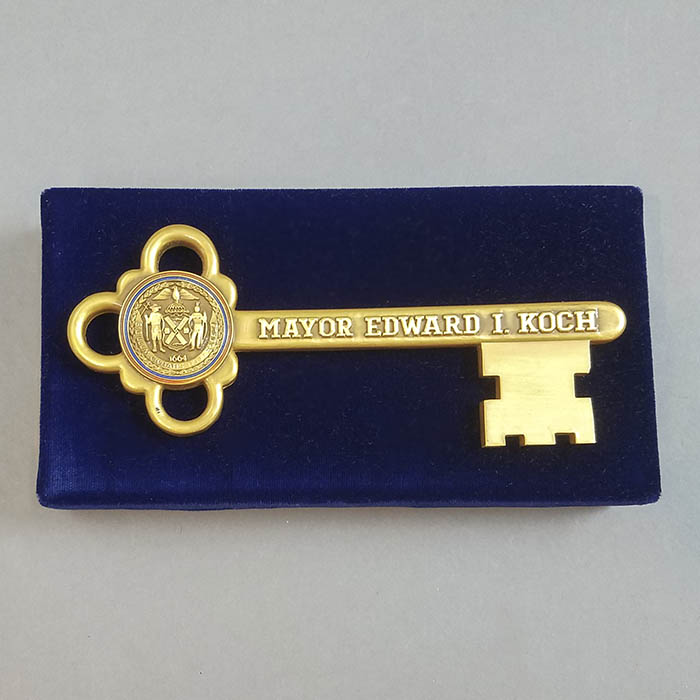 The key has a gold-plated finish. It is in its original blue velvet box from the jewelry maker who produced it. The box has a gold-wash plaque on the top engraved “Facsimile of Key made in 1812 for the Door of City Hall, New York.” The key bears the seal of New York City and “Mayor Edward I. Koch” in raised letters. The velvet box is in turn in its original white cardboard box, with an identical presentation plate. In addition, the white box has the original square auction sticker, and a star-form gold auction sticker, both from William Doyle Galleries.