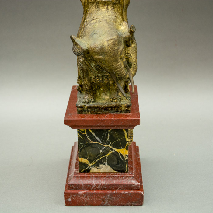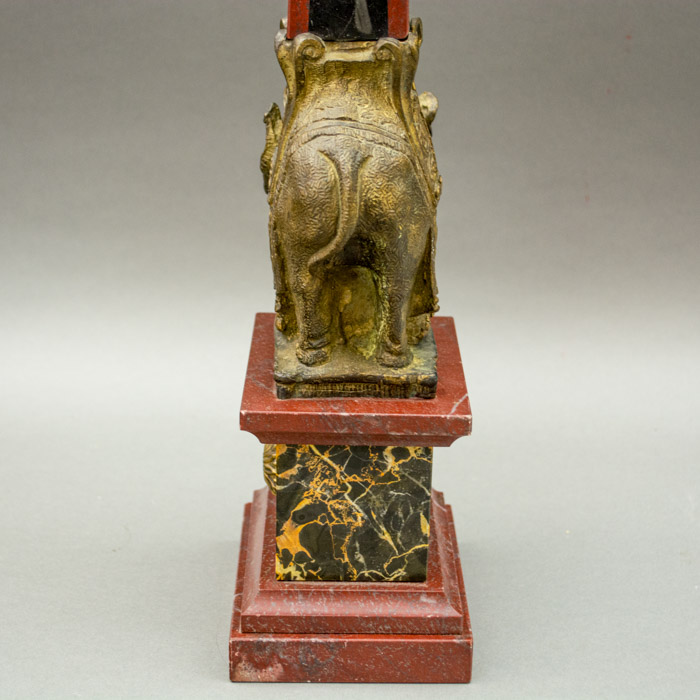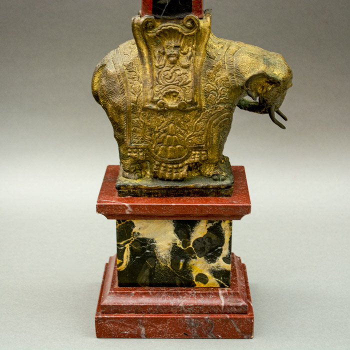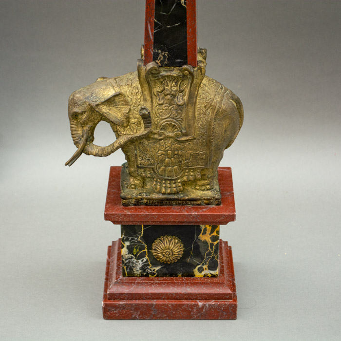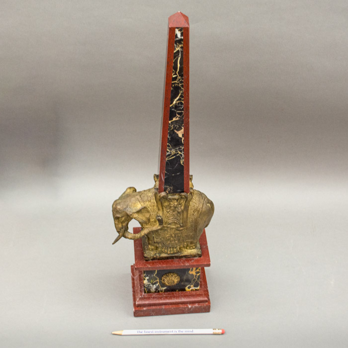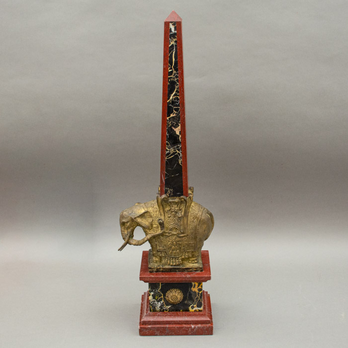 The offered elephant and obelisk model is representative of fine collectibles known as “Grand Tour” souvenirs. From the 17th to 19th Centuries, young English and other European aristocrats embarked on the Grand Tour – an extensive trip throughout Europe as an introduction to ancient and Renaissance architecture, art, and culture. Generally the focus was the classical antiquity of Rome, with travel throughout Italy and often in France as well. In this Age of Enlightenment, such travel was intended to broaden the horizons of the traveler, and was considered an educational rite of passage especially for young architects. Interest in the classical world spiked upon the discovery and excavation in 1758 of ancient cities Italian cities of Pompeii and Herculaneum, rich with Roman frescoes and artifacts. As part of the Grand tour, the visitors purchased antiquities as well decorative arts modeled after them. They often also purchased fine art often portraying ancient architecture and ruins. The custom of Grand Tour flourished through the English Regency, though continued thereafter during the Victorian era. Travelers from the Americas also participated in Grand Tour from about the mid 18th century on.