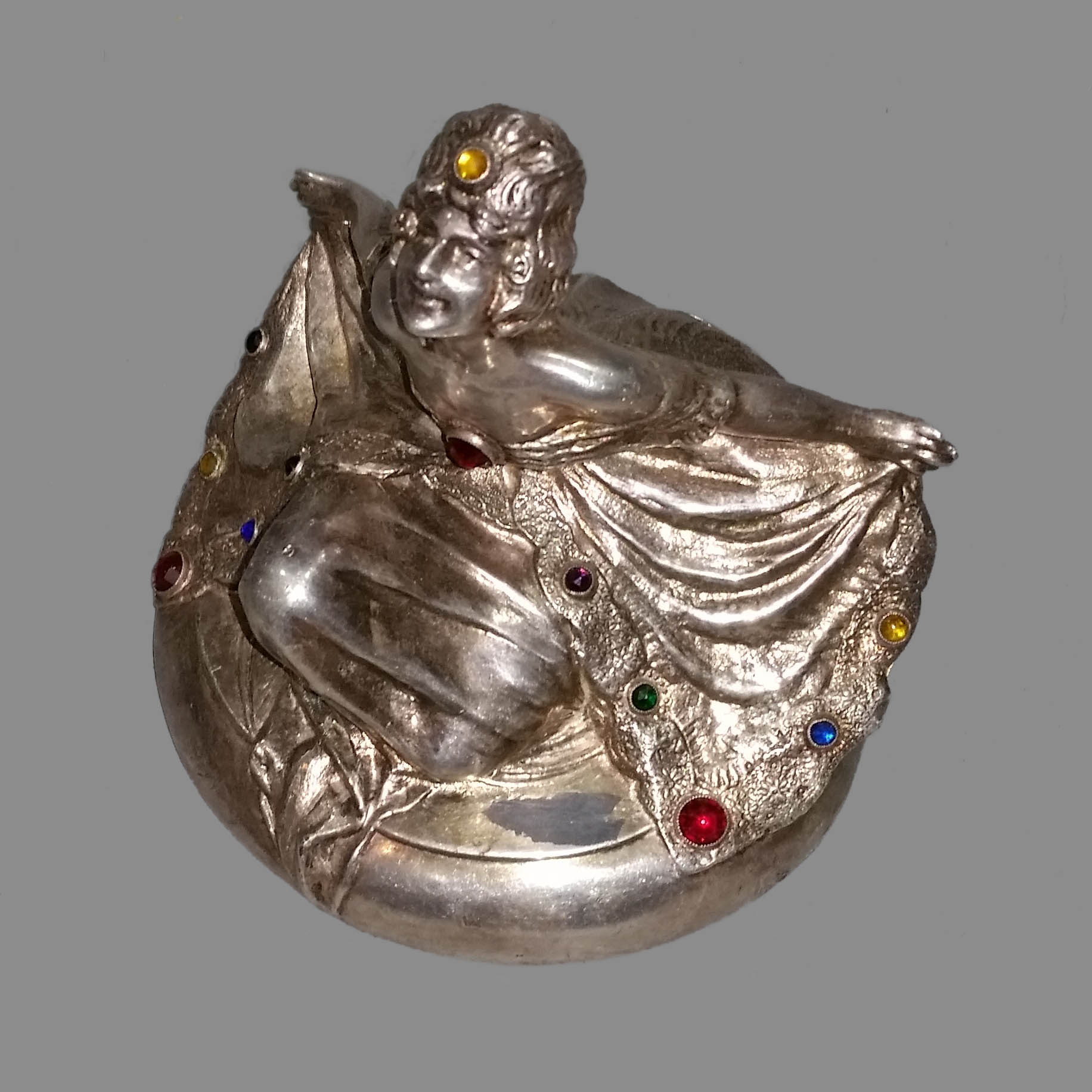 Ornamental lid for the top of a compact powder container, in the form of a seated woman in a full-length gown and cape, her arms outstretched, her smiling face tilted upward. The cape and her hair are decorated with faceted glass jewels. Weidlich Brothers Manufacturing Company in Bridgeport, Connecticut, primarily produced silver-plated decorative objects. The company was founded in 1901 by brothers Louis, Frank and William Weidlich. Louis was also one the principle designers, along with Alfred J. Flauder. Both held many design patents for items produced by the company such as jewelry cases, salt and pepper shakers, candlesticks, cigarette lighters, trophies, vanity table objects, and table ware. They also collaborated on two patents for metalwork manufacturing methods. The company closed in 1950.