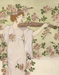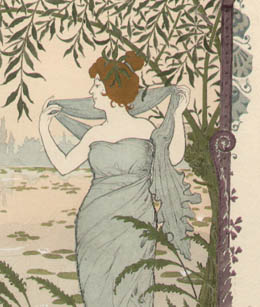 Pair of prints from a series demonstrating floral ornament in Art Nouveau style compositions. One shows a slender woman in a flowing gown playing the violin, wreathed in vines bearing large pink flowers, which also forms the print’s border. The other, a landscape at dawn, shows an elegant woman in a pale blue gown and shawl before a pond filled with water lilies and two nude bathers. That entire composition is set within an elaborate border decorated with ferns, butterflies and bows.