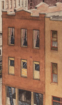 The watercolor was painted only one year after the Empire State Building had officially opened. As the tallest building in the world it stood as a symbol of American technological achievement and an Art Deco icon of New York City. At the time of the painting, it did not yet have the large antenna tower on the top that we associate with it now — that was not erected until the 1950s.