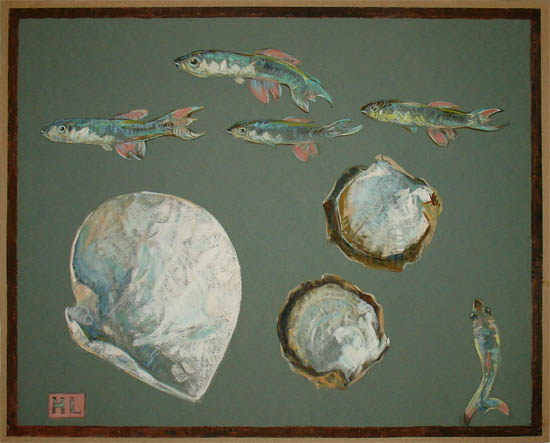The artist’s monogram, “HL” in a rectangle lower left becomes part of the composition, a device she perhaps borrowed from Japanese art. Although the artist more frequently signed her works by printing her full name, another example of a work signed with initials in the lower left is a drawing entitled “The Artist’s Studio from the Chopping Bowl,” issued as a postcard.