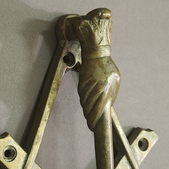 A fine Masonic door knocker featuring a sleeved hand holding a gavel, hinged at the top to knock on backplate formed as a Masonic square and compass symbol. Has five screw holes, as issued, for mounting on a door, probably of a Masonic lodge. Impressed twice with casting foundry name. The square and compass is the most universal symbol of Freemasonry. New Star Brass & Bronze Works was until recently still in existence at 178 Stockholm Street in Brooklyn as a custom fabricator and installer of metal railings.