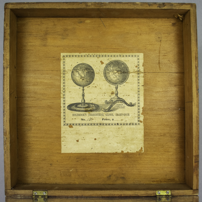 American globe-maker catalogs of the period document that certain globes were supplied in plain utilitarian boxes of this type for storage and transit. A few larger Holbrook boxes survive containing other apparatus: orreries, tellurians, and geometric teaching blocks. Slightly more elaborate globe boxes by competitors such as A.H. Andrews in the later 19th century opened to form a hanging shelf for display. Surviving examples of American globes retained in their original boxes are quite rare, and as indicated above, the present example is of particular documentary interest for its label, which preserves both the otherwise unrecorded “Holbrook Apparatus Co.” imprint and a graphic record of the firm’s stand variants for the eight-inch globe.
