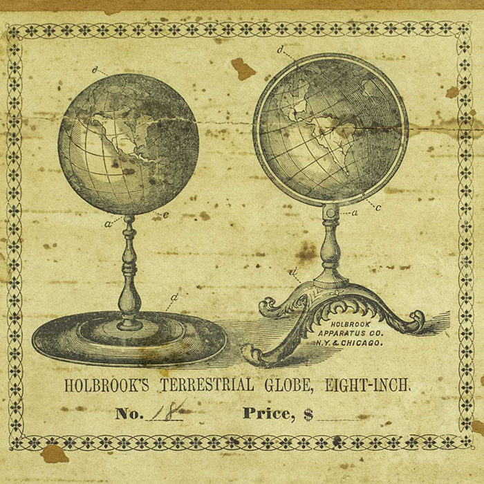 The Holbrook globe making family traces its origins to Josiah Holbrook (1788–1854), founder of the American Lyceum movement and a pioneer of object-based pedagogy, who began producing educational apparatus in Connecticut in the 1830s and subsequently relocated his business to New York City. His sons Alfred and Dwight established a “Lyceum Village in Berea, Ohio in 1840, operating the family enterprise as Holbrook & Co. Dwight returned to Connecticut in about 1854, opening a manufacturing company in Wethersfield, Connecticut, notably making use of contract labor from the Wethersfield State Prison. In 1855, Dwight opened a salesroom in Hartford under the name Holbrook School Apparatus Co., trading under the motto “Good enough for the best, and cheap enough for the poorest.” Dwight and Alfred Holbrook discontinued direct retail in about 1860 and transitioned to distribution through school suppliers including A.H. Andrews of Chicago and James W. Queen of Philadelphia. Dwight’s son Charles succeeded to the business in the 1870s, locating in Chicago as it emerged as a major railroad hub and center of map and globe production.