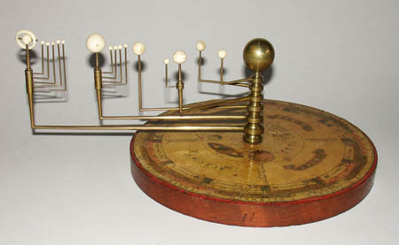 The brass orrery (called a planetarium by Jones), stored in its contemporary small mahogany box (contained within the larger mahogany box), is an alternate attachment. For use it is screwed by threads into the platter (in place of the tellurian) to show relative motion and sizes of the planets (though not to scale) from Mercury to Saturn around the central brass sphere sun. Each ivory planet on individual rod, and its moons as raised on respective L-shaped brass rods, can be turned by hand. Earth has one moon, Neptune has four moons, and Saturn has five moons and a ring.