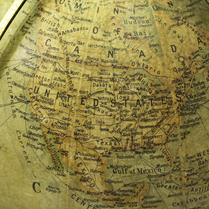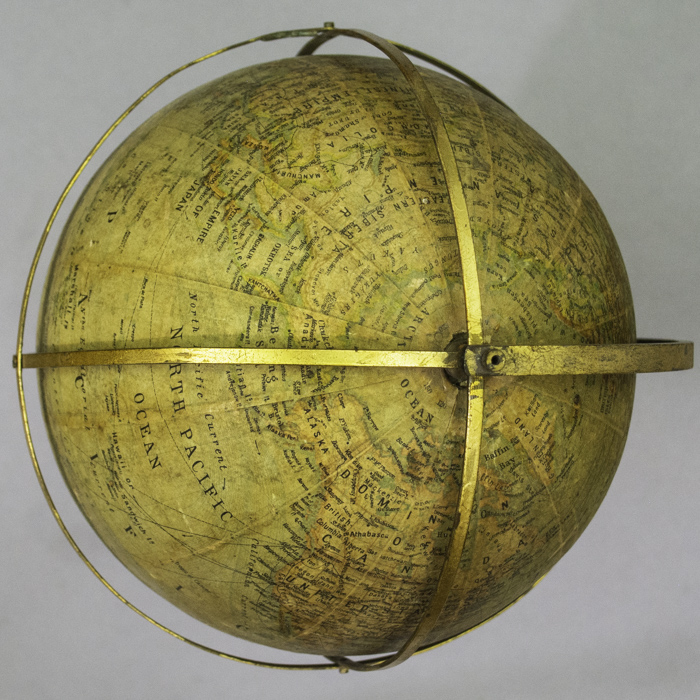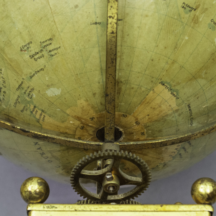 Certain cartographical features date the globe to between 1890 and about 1907. For example, modern-day Oklahoma is divided between Oklahoma, referring to Oklahoma Territory in the west, and Indian Ter., an abbreviation for the Indian Territory in the east. These boundaries reflect the 1890 Oklahoma Organic Act, which created the Oklahoma Territory and Indian Territory out of a combination of the region’s “unorganized” Indian Territory, Greer County, and the Oklahoma panhandle. Prior to the incorporation of the panhandle into Oklahoma Territory, it had been designated as a “neutral strip” starting in 1820 with the drawing of the 36°30′ line in the Missouri Compromise. In 1907, Oklahoma achieved statehood, and was indicated on globes as such at that time or shortly thereafter rather than a territory in any part. A second telling feature is the division of the Dakotas, named Nth. Dakota and Sth. Dakota, in accordance with the admission of North Dakota and South Dakota as the 39th and 40th states in November 1889. In addition, St. Petersburg is indicated in the Russian Empire, consistent with a date before about 1914; regardless Oklahoma prior to statehood dates it earlier as set forth above.