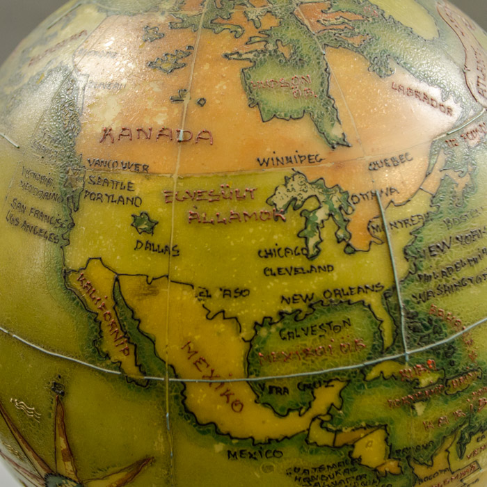 An unusual hand-painted electrified glass terrestrial globe on a rococo cast iron base with place names in Hungarian. Oceans are olive green; countries are yellow, orange, and light green. The painted geographical borders, names, and decorative illustrations are in raised black, brown and green relief lines. The globe is wired to plug into an outlet with a light bulb inside. When turned on, it glows a golden color. Present-day St. Petersburg is called Leningrad, dating it to after 1924; Anglo-Egyptian Sudan is shown dating it to before 1956. However, India is shown but not Pakistan, likely dating it even prior to 1947.