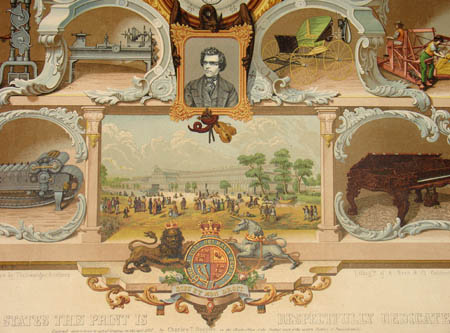 This lithograph bears the caption, “To the people of the United States this print is respectfully dedicated by Charles T. Rodgers.” The year this print was issued, Rodgers also compiled a book about the 1851 Great Exhibition with the same title: American Superiority at the World’s Fair (Philadelphia, J. J. Hawkins, 1852). The book contained reprints of newspaper articles from the British and U.S. press about the American exhibits and the yacht race, along with the texts of speeches delivered at dinners and awards ceremonies related to these events. Perhaps Rodgers intended this lithograph as another means of promoting and commemorating the event. It is also possible that this print served as a broadside advertisement for Rodgers’ book. This was not the only large print of this subject matter — the Smithsonian National Museum of American History has a print in its collection with the title American Superiority at the World’s Great Fair published in 1851 by Perkin’s Sun Lithographic Establishment, New York. The Perkin’s print is similarly constructed with related imagery, though Rodgers’ print is in color and more comprehensive (see References below).
