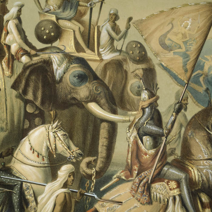 Soltykoff visited Lahore during a tumultuous period in Punjab history, which is perhaps alluded to by the man hanging from the gallows in the background. Sher Singh was the second son of Ranjit Singh, unifier of Sikh Punjab and the first Sikh ruler of the region. When Ranjit died in 1839 after a 40-year reign, the Hindu Dogra brothers and the Sikh aristocracy fought for control. Amidst the turmoil, Sher Singh only managed to reign from 1841 until his violent death in 1843. Several years of fighting culminated with the British entering the conflict in late 1845; by 1849 Lahore was officially under British control. During the nineteenth century, the British and other Europeans were eager to learn about India’s complex and highly developed cultures that were so different from their own.