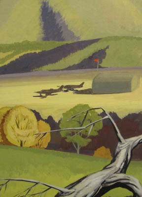 Painting, executed in bold flat areas of color, of a mobile hexagonal radar dish mounted on a United State Air Force tank, its back door opened to reveal radar operating equipment inside. The tank, accompanied by three soldiers, is shown with fresh tread marks atop a grassy hill in a landscape suggestive of the American Southwest. In the distance, two Air Force jets make a sharp ascent and a few others sit outside a hangar on a flat plain. The radar instrument shown was probably produced or proposed by defense contractor, Westinghouse Electric Corporation in the early 1960s.