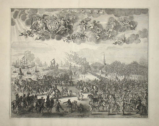 Lively engraving depicting the triumphal departure of Charles II of Scotland from the Netherlands on his way back to England to reclaim the British throne after 11 years in exile abroad. A crowd has gathered at the harbor of Scheveningen to see him off. In the sky are winged gods and putti holding crowns and the seal of Great Britain, beneath a ribbon bearing the Latin motto, “Quo fas et fata nos vocant” (“where duty and the fates call”). The engraving is one of six originally published in an account of Charles’s journey from Breda to Scheveningen from May 25 to June 2, 1660, with stops along the way to meet with the Dutch monarch and address the Parliament.