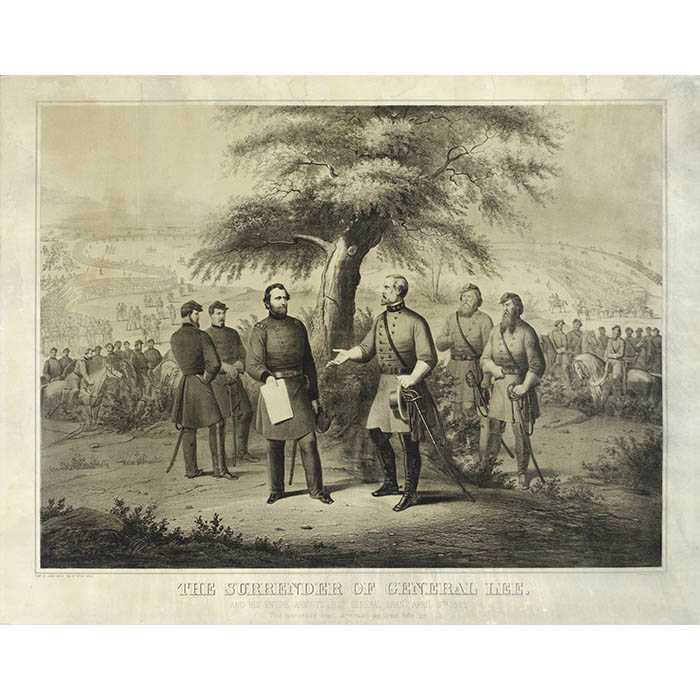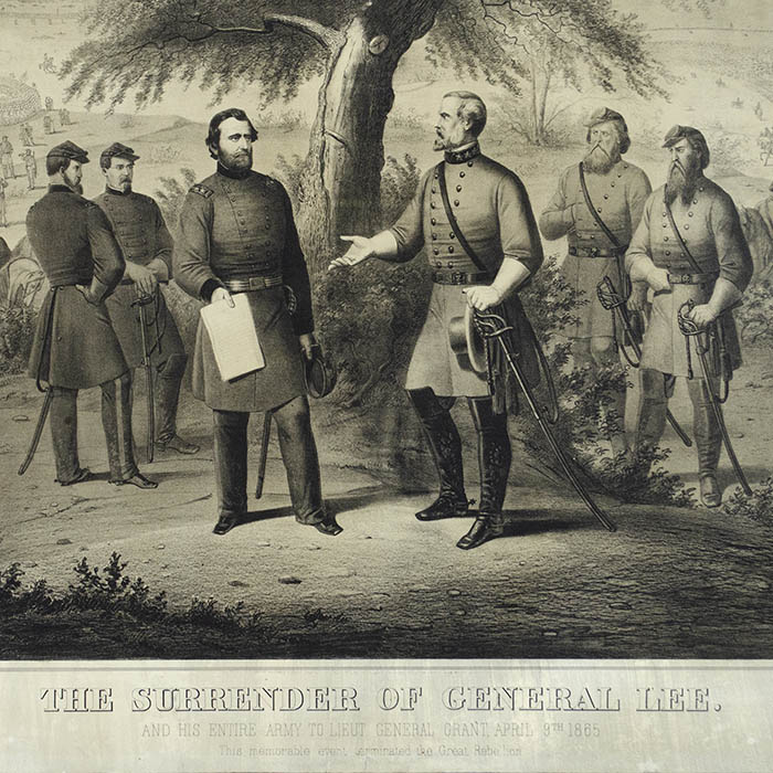 Full title beneath image: “The Surrender of General Lee. And His Entire Army to Lieut. General Grant, April 9th 1865. This memorable event terminated the Great Rebellion.”
