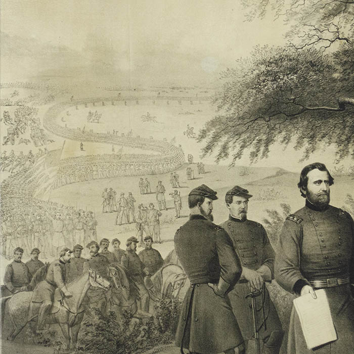 In this image, the artist took considerable license in portraying the event, showing the surrender taking place outdoors; the generals actually met inside a private home In the left foreground, Grant folds the document with the terms of surrender, while Lee extends a gloved hand toward him. They are each accompanied by a pair of aides who regard each other warily, and behind them Union and Confederate officers wait on horseback in the middle distance. Two long snaking line of thousands of soldiers stretch behind them into the distance, with the closest one, on the left, headed by a man carrying an American flag. In addition to this triumphant procession, the artist has added other symbolic propagandistic touches: the neatly groomed Union aides as apposed to the scruffy Confederates, and the scarred tree in the center, which is leafy on Grant’s side, but scraggly and missing most of its bark on Lee’s side. Indeed, according to the National Park Service, “there is no formal surrender document. The surrender was conducted through an exchange of two short letters. Grant’s was a mere five sentences long and Lee’s reply was only three very short, terse sentences. Aside from Grant and Lee, only Lt. Colonel Marshall and perhaps a half dozen of Grant’s staff officers were present for most of the meeting.”