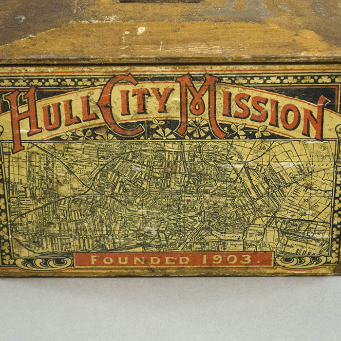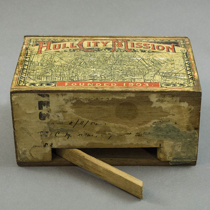 The Hull City Mission was an interdenominational social services organization founded in 1903 with representatives of the Anglicans, Wesleyan Methodists and Friends. As a history of the city notes, “Its work was purely evangelistic: in 1916, for example, it visited 27,000 homes and made 761 converts, ‘reclaiming’ 76 drunkards and 20 fallen women.” It is likely that collection boxes such as the one offered were circulated in Protestant churches and other local venues and that the label on the bottom was a way to keep track of them.